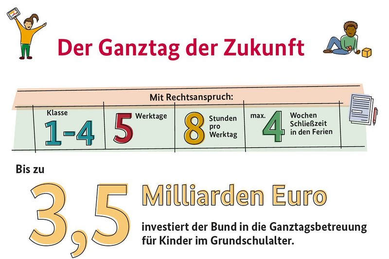 Durch die stufenweise Einführung eines Rechtsanspruchs auf Ganztagsbetreuung von Kindern im Grundschulalter ab 2026 wird die Zahl der ganztägig betreuten Kinder auch in Niedersachsen weiter steigen. Ab August 2026 sollen zunächst alle Grundschulkinder der ersten Klassenstufe einen Anspruch erhalten, ganztägig gefördert zu werden. Der Rechtsanspruch auf Ganztagsschule sieht einen Betreuungsumfang von 8 Stunden an allen 5 Werktagen vor, inklusive Unterrichtszeit. Die Schließzeit in den Ferien beträgt maximal 4 Wochen. In den Folgejahren wird der Rechtsanspruch um je eine Klassenstufe ausgeweitet. Damit hat ab August 2029 jedes Grundschulkind der Klassenstufen 1 bis 4 einen Anspruch auf ganztägige Betreuung.